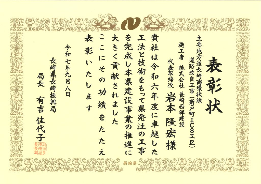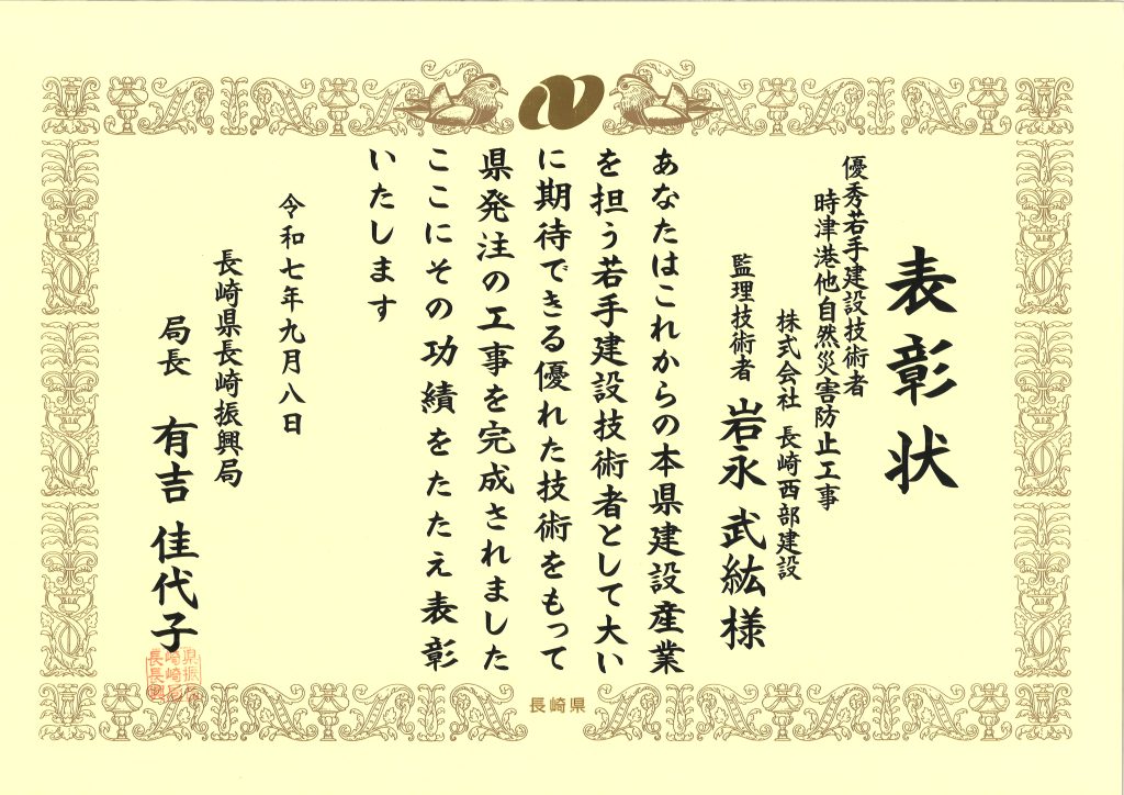 国土交通省九州地方整備局より【令和7年度工事成績優秀企業認定】を受けました。